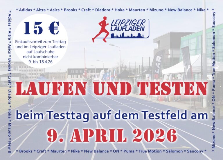 Am 9. April 2026 kannst du wieder Laufschuhmodelle vieler Marken live und in Farbe auf dem Testfeld testen. Genug Zeit noch einen neuen Wettkampfschuh für den 10 Tage später stattfindenden Leipzig Marathon zu finden. Um sie unter Wettkampfbedingungen zu testen, kannst du beim Leipziger Stundenlauf teilnehmen, der parallel um 18 Uhr startet und von der LG eXa veranstaltet wird.